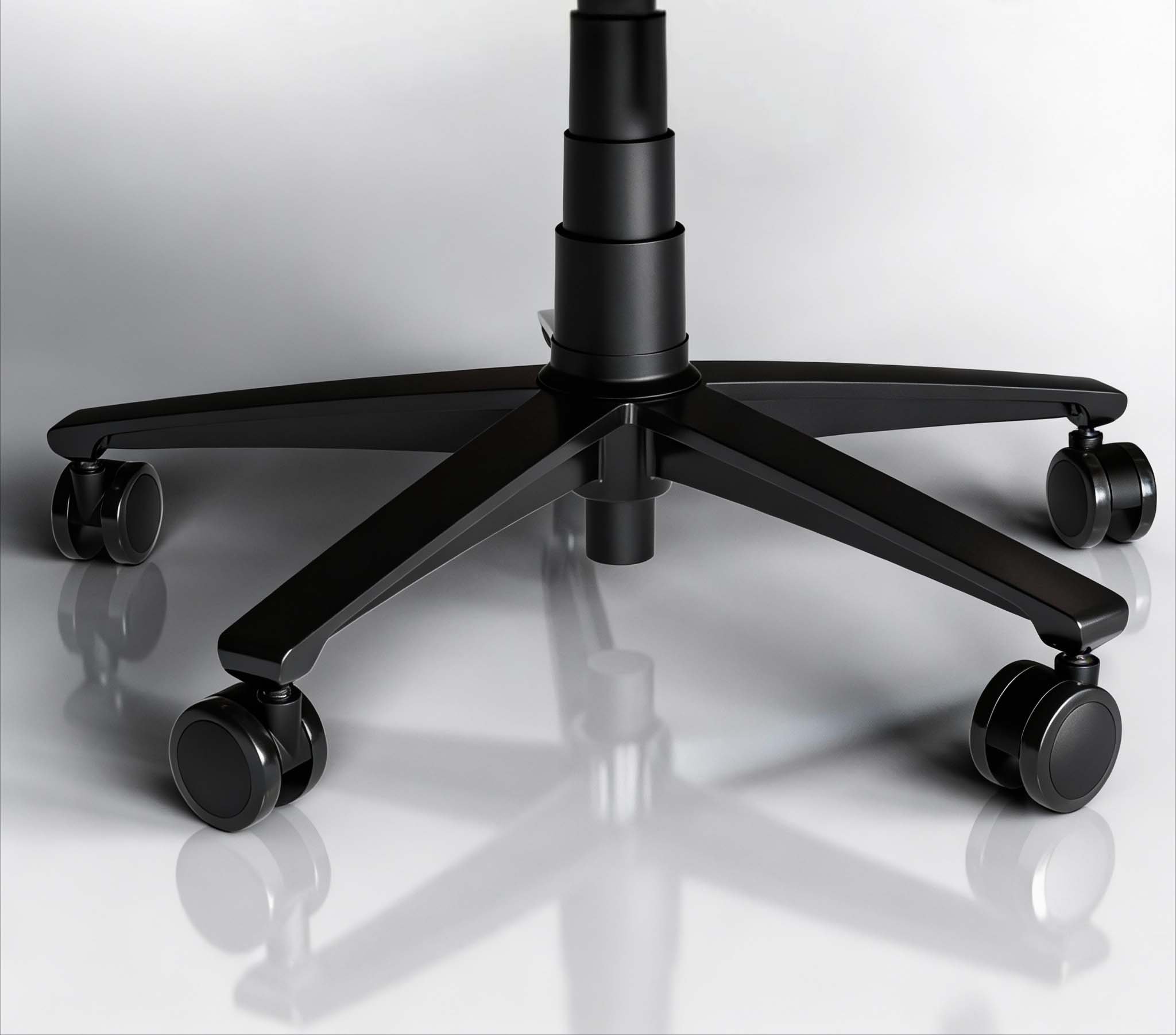 - The chair base is made of high-strength epoxy-coated black steel, designed to support heavy weights up to 180kg safely. The base is 70cm in diameter, featuring high-quality rubber-cushioned rolling wheels for smooth movement.